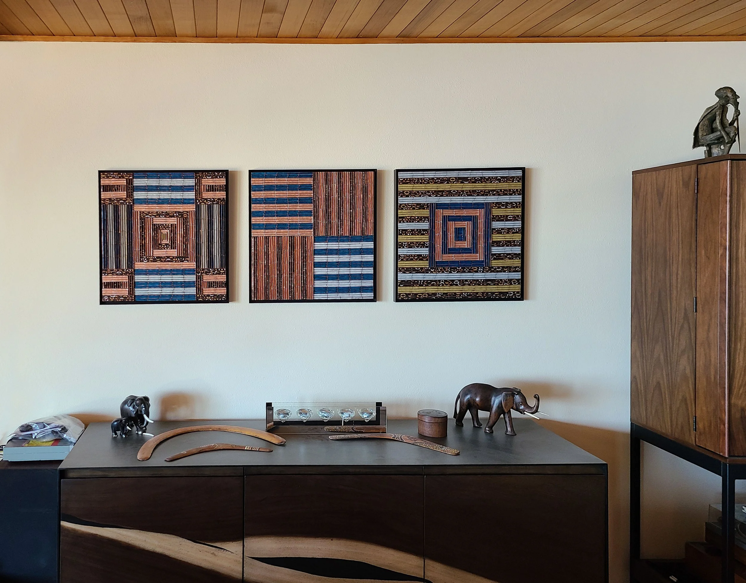For many years I wove using paper as my medium. The weavings were adorned with beads and metallic threads, adding further texture and complexity. My continued interest in working with paper has led me past traditional weaving. I am still working with paper but am now dipping it in encaustic wax and gilding the edges with gold, copper and silver leak inks. The strips are folded and layered for structure. I create elegant, minimal, composed works often based on universal textile designs. The folded, gilded structures allow me to play with light more effectively. The work shimmers with quiet energy.